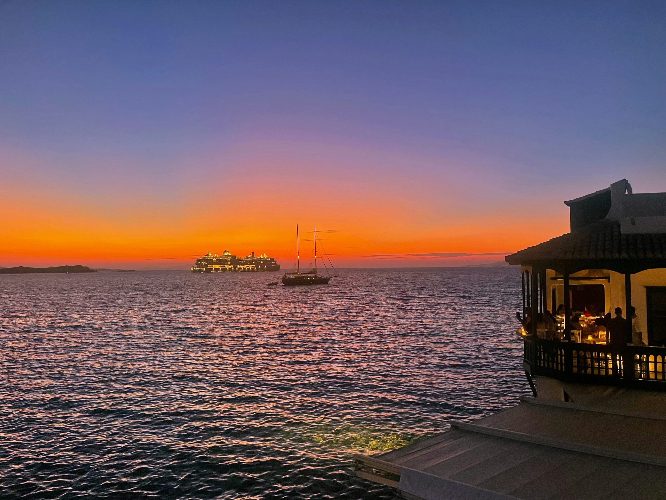 Mykonos is an island of contrasts. By day, it greets visitors with shimmering blue waters, bright sunshine, and a relaxed
