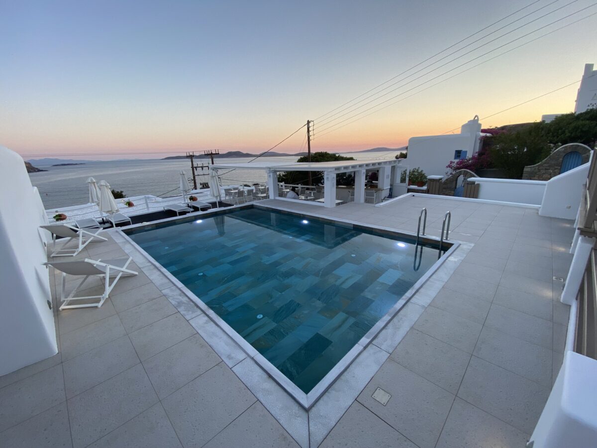 Guests can enjoy a generous continental breakfast served daily by the pool, along with drinks and light snacks throughout the day, all in a tranquil setting overlooking the sea and open sky. The atmosphere is quiet and welcoming, perfect for unwinding after a day of exploring Mykonos.