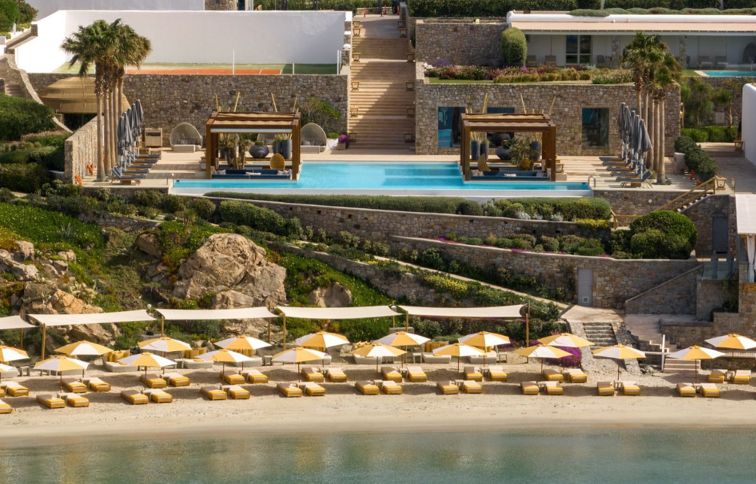 is nestled on a private peninsula in Ornos Bay, offering an extraordinary beachfront setting with its own sandy beach and endless views across the sun-drenched Aegean horizon. Designed like a traditional Mykonian village cascading down toward the sea, the resort embodies a perfect harmony between elegance and nature, warmth and beauty.