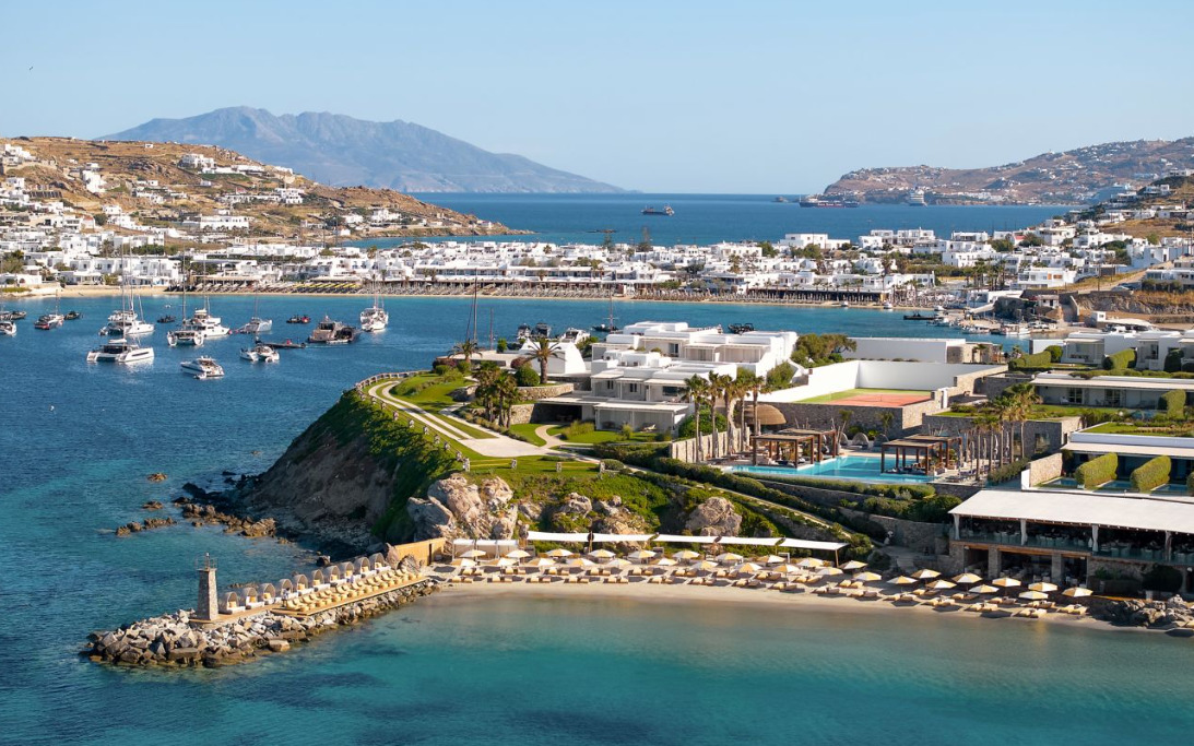is nestled on a private peninsula in Ornos Bay, offering an extraordinary beachfront setting with its own sandy beach and endless views across the sun-drenched Aegean horizon. Designed like a traditional Mykonian village cascading down toward the sea, the resort embodies a perfect harmony between elegance and nature, warmth and beauty.